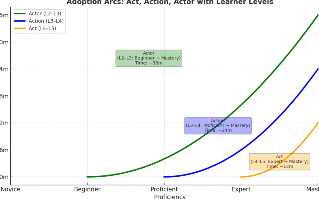 - Development-Heavy Zone (Extended Time-to-Performance). Learners in Level 1 require significant Actor development before adoption is possible.